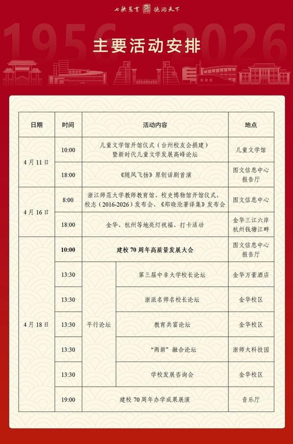 根据安排,学校将于4月18日隆重举办建校70周年高质量发展大会、第三届中非大学校长论坛、浙派名师名校长论坛、教育共富论坛、“两新”融合论坛及办学成果展演等系列重点活动,相关详细日程与最新信息均可通过校庆专题网站查询了解。