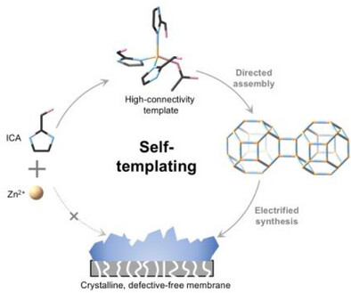 工业气体分离中,聚合物级丙烯生产等场景对膜材料的选择性和通量提出双重要求,传统低温蒸馏能耗高昂,膜技术因节能优势成为理想替代方案。ZIF-8膜是丙烯/丙烷分离的基准材料,但气体透量有限,其同构衍生物ZIF-90孔径稍大,理论上可提升通量。电合成法能快速制备MOF膜,却因ZIF-90的配体质子解离能力更强(pKa更低),反应动力学过快易生成无定形产物,导致直接电合成高结晶度ZIF-90膜面临巨大挑战,亟需开发调控结晶过程的有效策略。该研究开发了自模板辅助的电合成策略,成功突破了ZIF-90膜电合成中结晶性差的技术瓶颈。所制备的ZIF-90膜将丙烯渗透率提升至ZIF-8的9倍,同时保持优异分离选择性,还具备丁烷异构体分离能力和良好的稳定性。这项研究不仅为高效气体分离膜提供了实用候选材料,更为快速制备高性能同构MOF膜提供了通用设计思路。