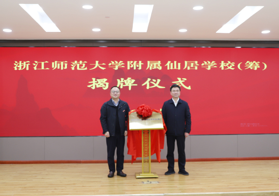 浙师大副校长李盛与仙居县委副书记、县长马奇华共同为浙江师范大学附属仙居学校揭牌。图片来源 教育集团