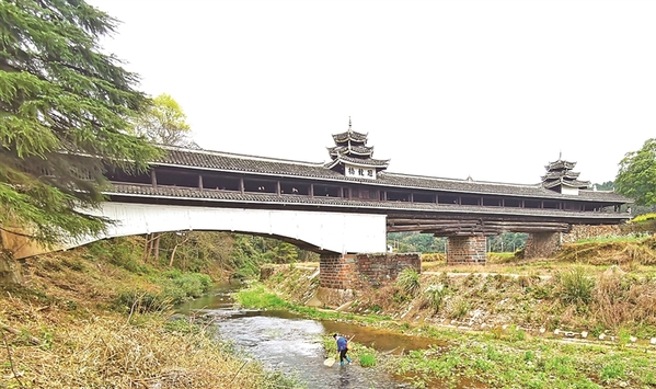 3月19日的早晨,记者走进广西三江侗族自治县平岩村。细雨刚停,石板路面还留着雨水的痕迹。街巷静谧,大多数店铺还未开门。一位大嫂刚煮好一壶姜茶,见记者远道而来,便热情地递上一杯。听闻记者是为村边的程阳桥而来,她的眼中满是骄傲。她说村里人从小就在程阳桥上跑来跑去,太阳毒了、刮风下雨了,有事没事,大伙都会到桥上坐坐,聊聊天、下下棋。有时候,女子们坐在一处唱唱歌,手里搓麻绳、做针线活也不耽误。这几年,因为这个桥有特色,越来越多外地人来旅游,于是,像她这样原本在外打工的人回家来开小店的也多了。“程阳桥是萨玛(侗族的祖先)留下的宝贝,守着它,就是守着家乡了。”大嫂笑着为记者续满姜茶。