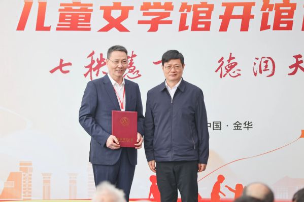 浙师大党委书记蒋云良代表学校向儿童文学馆捐建人、台州市书生中学党委书记陶仙法颁发捐赠证书。浙师大融媒体中心 李俊驰 摄