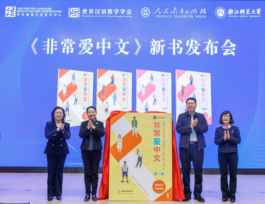 开幕式后举行了《非常爱中文》新书发布会。该丛书是首套面向非洲青少年的初级中文分级读物,系教育部中外语言交流合作中心支持项目,由浙江师范大学非洲中文教育实践与研究基地参与研发,人民教育出版社出版。发布会上,徐丽华代表浙师大作者团队介绍了丛书编创背景、编写理念与主要特色。郑旺全在致辞中表示,人教社愿继续与教育部语合中心及全国各高校携手合作,以优质资源和融合出版力量赋能全球中文教育。随后,于天琪、郑旺全、张建珍、徐丽华共同为新书揭幕。