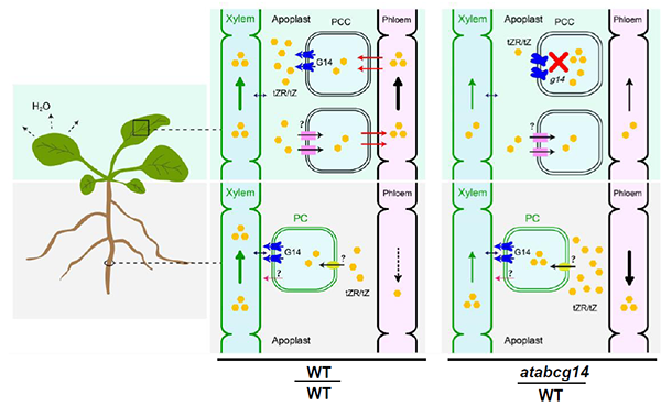 细胞分裂素(Cytokinin, CK)是一种重要的植物激素,在植物生长发育和抗逆过程中发挥重要作用。CK在植物体内主要以iP类和tZ (trans-zeatin)类形式存在。 tZ类CK主要在根部组织合成,在蒸腾拉力的作用下通过导管运输到地上组织。ABC 转运蛋白AtABCG14负责根部tZ类CK由中柱鞘向导管的装配,但是tZ类CK在通过导管运输到地上组织后如何卸载和分配尚不清楚。