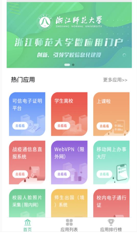 在数字化改革中,浙师大始终坚持以“人”为本,从师生需求出发,为加快建设全校大数据中心的重点任务,学校完成了15个业务部门126张数据表1700余项数据字段9000万条记录的全量校务数据集成工作,完成采集标准身份认证照片2万余套。浙师大的师生几乎人人都关注了浙江师范大学企业号。企业号先后推出“浙师移动办事大厅门户”“浙师综合查询门户”“浙师微应用门户”三大移动服务新平台,实现80余项服务一键办理,22项内容一键查询,18项应用一键登录,真正实现了“云上浙师”。其中“浙师微应用门户”涵盖了可信电子证明、师生出国(境)系统、战疫通打卡、移动网上办事大厅、校园人脸照片采集等多个应用内容。