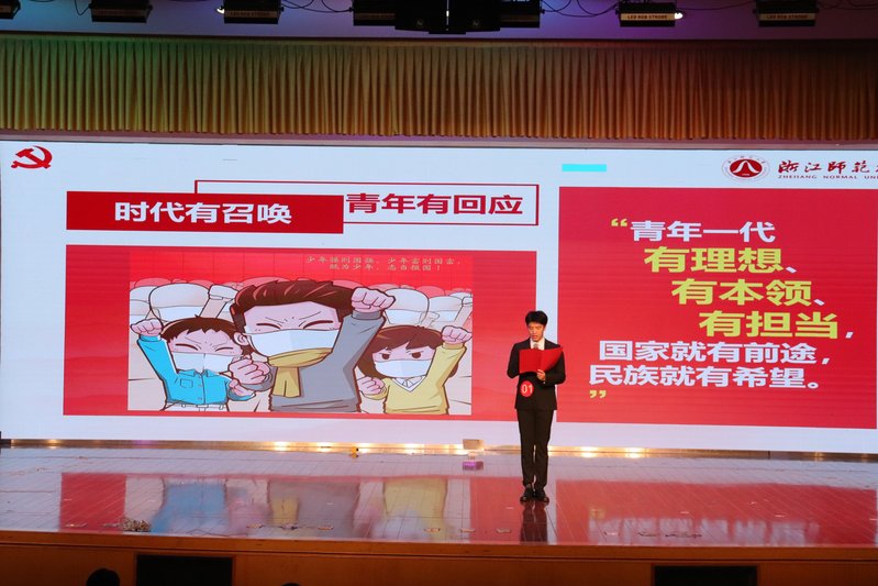 “时事评论”环节,选手们对材料的解读鞭辟入里,由大众所熟知的时事出发,挖掘其蕴含的深层寓意,展现新时代青年的思考。来自外国语学院的蓝沁霄将一位清华贫困生的温暖故事娓娓道来。“磨难写成诗,活成一道光”,“照亮哪怕其他一个人也好”的感恩之心、“自强不息,厚德载物”的精神品质支撑这位学子凝聚微薄之力资助了四个孩子上学,选手流露的真情直抵人心。“一条大河,波浪宽,风吹稻花香两岸……”悠扬歌声饱含深情,来自马克思主义学院的唐冰钰用一首《我的祖国》唱出了袁隆平的“禾下乘凉梦”,向袁老一梦逐一生的伟大精神致敬,“良田千顷不过一日三餐,广厦万间只睡卧榻三尺”,袁老的精神鼓舞着浙师学子为实现中国梦坚持不懈、吃苦耐劳、奋斗终身。结合“双减”政策、浙江共同富裕示范区、首位载人飞船上的女航天员王亚平、孟晚舟归国、党的新赶考之路等时事热点,选手们依托大视野、宽领域的时代平台优势进行深入思考,他们赋予文字以时代生命特色,用故事历数社会发展宏图,表达对于使命担当的深切思考,一展新时代青年本色。