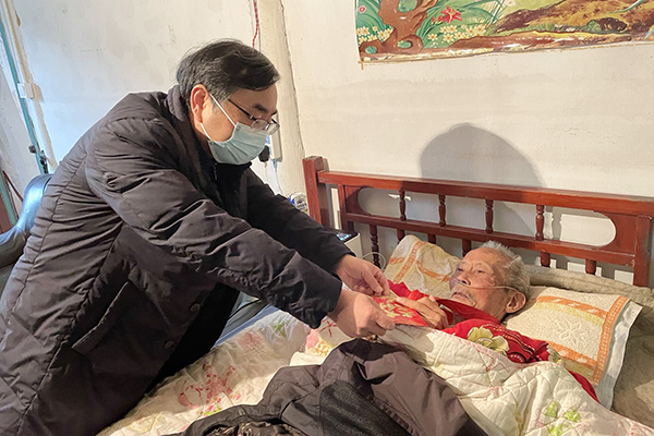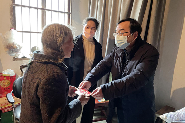 1月17日上午,在武义县大田乡瓦窑头村91岁高龄的徐文星老人家里,浙师大副校长张根福正握着老人的手,与他亲切交谈,并送上了慰问款。老人虽然卧病在床、讲话困难,但还一个劲地表示感谢,并招呼老伴为大家倒茶。