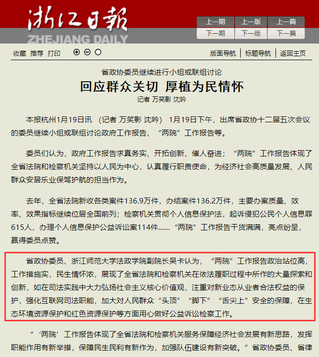 吴卡委员认为,浙江作为习近平法治思想重要萌发地和法治中国建设重要实践地,应充分发挥八大法治优势,加快打造八大法治文化高地,为建设法治中国示范区提供法治思想保证。同时建议加强我省涉外法治人才培养,通过坚持“系统性法治观”和“整体性治理观”,进一步加强涉外法治工作战略布局,建立以实践为导向的涉外法治人才培养机制。