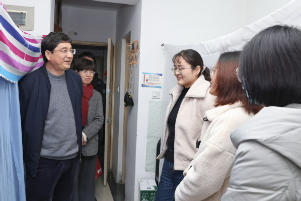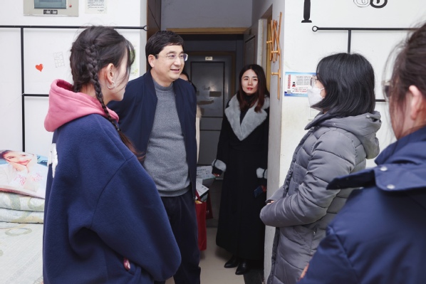 在启明公寓7幢的留校学生寝室,朱坚详细地询问了同学们的留校原因及学习、生活情况,并叮嘱同学们要充分利用好时间,注意劳逸结合,要多与父母沟通。地理与环境科学学院的杜焱来自四川,上个月他刚刚参加完硕士研究生考试,计划留校准备毕业论文,给自己的大学生涯交一份满意的答卷。“在学校和同学一起过年也是一次不一样的体验,要珍惜利用好时间,认真撰写毕业论文。”朱坚勉励他说。