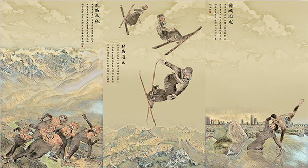 经历了整体策划、寻找素材、做风格迁移试验后,他们最终决定整体风格以王希孟《千里江山图》和赵佶《雪江归棹图》等传统宋画为创作蓝本,通过人工智能进行深度学习,再用神经网络算法进行风格化迁移,选取运动员家乡风景名胜和运动员夺冠竞技照为创作素材,共为金牌获得者创作9幅数字绘画作品。