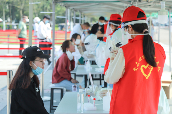 接到核酸志愿者的招募通知,生化学院的周舒扬同学毫不犹豫地报了名。炎热的天气里,戴上口罩和防护面具的不适应,长时间站立导致的双腿酸痛,暴晒下短暂的头晕不适,他都一一克服。“作为一名志愿者,能为疫情防控做出自己的贡献,特别有成就感。老师来给我们送水,同学们的一句‘谢谢’,换班志愿者的一声关切,都让我觉得所做的事情是有意义的。”周舒扬说。