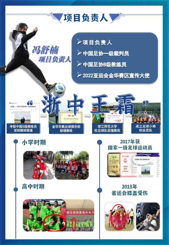 足球少女冯舒楠是中国足协一级裁判员、中国足协B级教练员、2022亚运会金华赛区宣传大使、金华华奥足球俱乐部助理教练和浙江师范大学校足球队助理教练。她负责的《足球小将——中国青少年足球智慧化先行者》项目荣获浙师大第十一届“挑战杯”大学生创业计划竞赛特等奖。