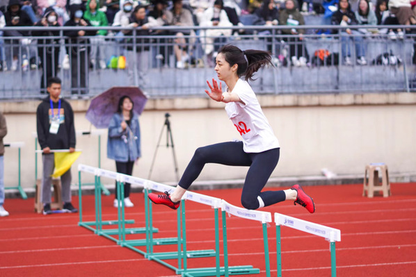 “砰”一声枪响,比赛一触即发,所有选手迅速起身奔向第一道栏。胡欢瑶反应迅速,身姿敏捷,以稳定的步频和迅猛的过栏速度大步向前。起跑、摆臂、跳跃、奔跑与过栏一气呵成,轻盈而迅捷的身影在赛场上一骑绝尘。最终,她以超第二名一栏的优势荣获甲组第一。