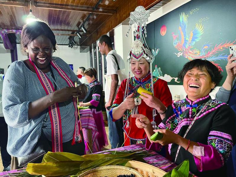外国友人们的脸上洋溢着笑容,大家在欢乐中感受畲族传统习俗的魅力。“我们带领外国友人体验包粽子、跳竹竿舞等传统文化,希望更好地促进畲族文化的传播,也促进中外友谊长存。”沐尘畲族乡行政服务中心副主任张润表示。