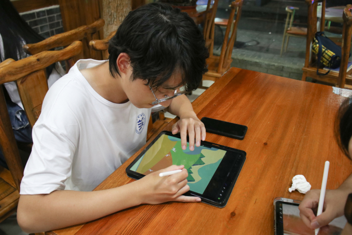 余村美丽乡村建设、生态文明建设等工作是全国文明村、全国美丽宜居示范村。为了更加深刻地体会绿色发展理念,实践队员先后采访了原余村村委书记、党员游客、青年创业家等不同群体,并依托专业优势,以绘制海报为媒介,通过画笔主动传递余村绿色生态的理念。