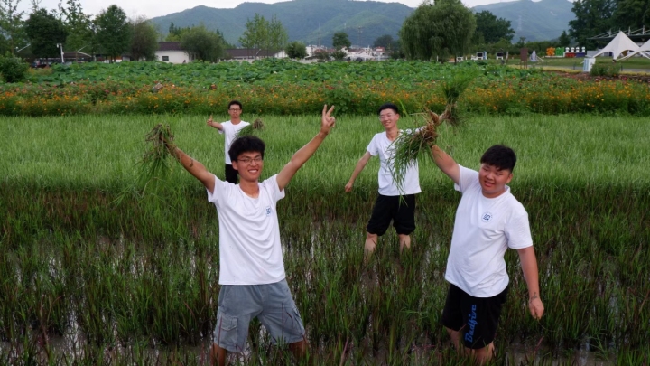 五彩水稻作为余村极具观赏性的农作物,是余村独特的田园风光。实践队员们挽起裤脚、扎根稻田、维护农作,体会着传统农耕方式的劳动乐趣,以实际行动践行着劳动最光荣的精神品质。同时,为助力乡村振兴建设,实践队围绕“发挥优势、培育优势、转化优势”的“八八战略”精神,还进行了水稻、茶叶、竹笋等特色产品的包装设计,以提升乡村特色农产品的识别度与审美感,助力乡村产业振兴。