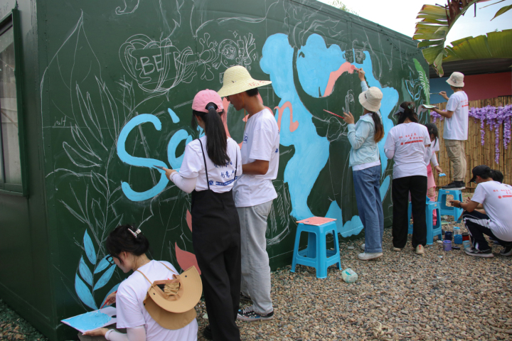 墙绘艺术以群众喜闻乐见的形式,描绘出了美丽乡村画卷,让乡村面貌焕然一新的同时,也使一面面墙壁变成美观且会“说话”的乡村文化传播者。在鲁家村,实践队员结合创客空间的环境定位,创意设计并绘画了墙绘图案,为乡村创客空间增添了一丝青春活力。