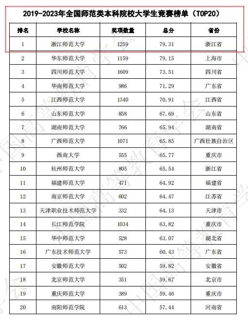 2024年3月22日,中国高等教育学会高校竞赛评估与管理体系研究工作组发布《2023全国普通高校大学生竞赛分析报告》,在2019-2023年全国师范类本科院校大学生竞赛榜单中,浙江师范大学位列榜首。